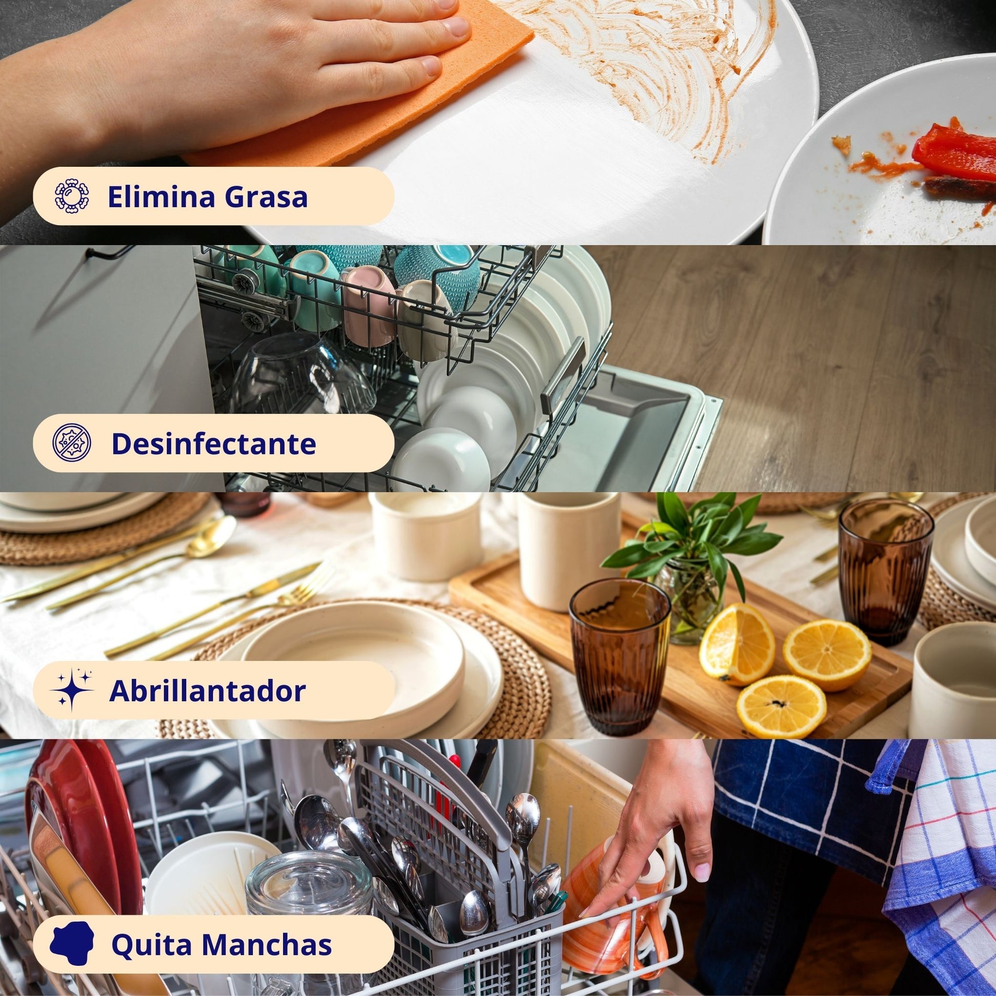 Funciona como detergente para lavavajillas, eliminando restos de comida, y como desengrasante, removiendo grasa difícil en distintas superficies.
